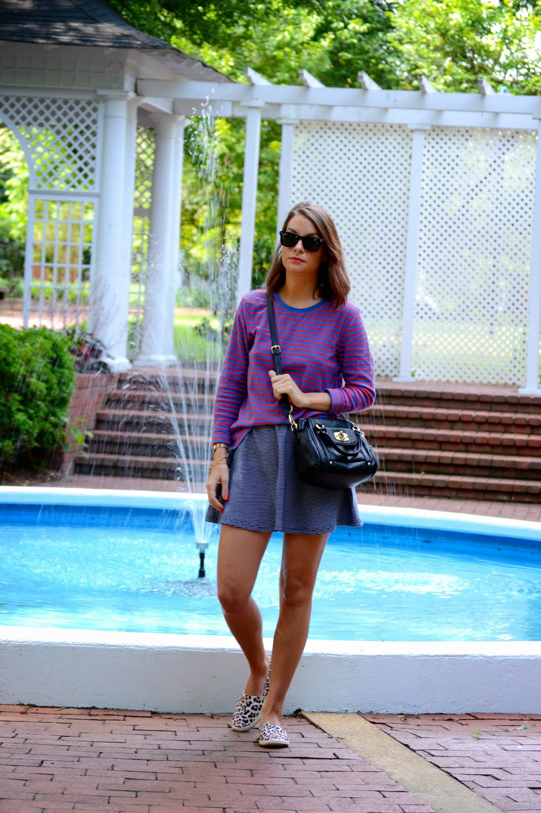 Stripes are the essential summer pattern, gives a nautical, laid back feel to your look. Patterns are easy to double up on especially when they are the same! An easy way to layer patterns is to find clothes with varying pattern sizes. For example on Amber: Larger striped tee with a slim striped skirt. Pair with cheetah print espadrilles gives a chic look. Both pieces are made of breezy soft materials which favor a at ease look. Let us know what you think!